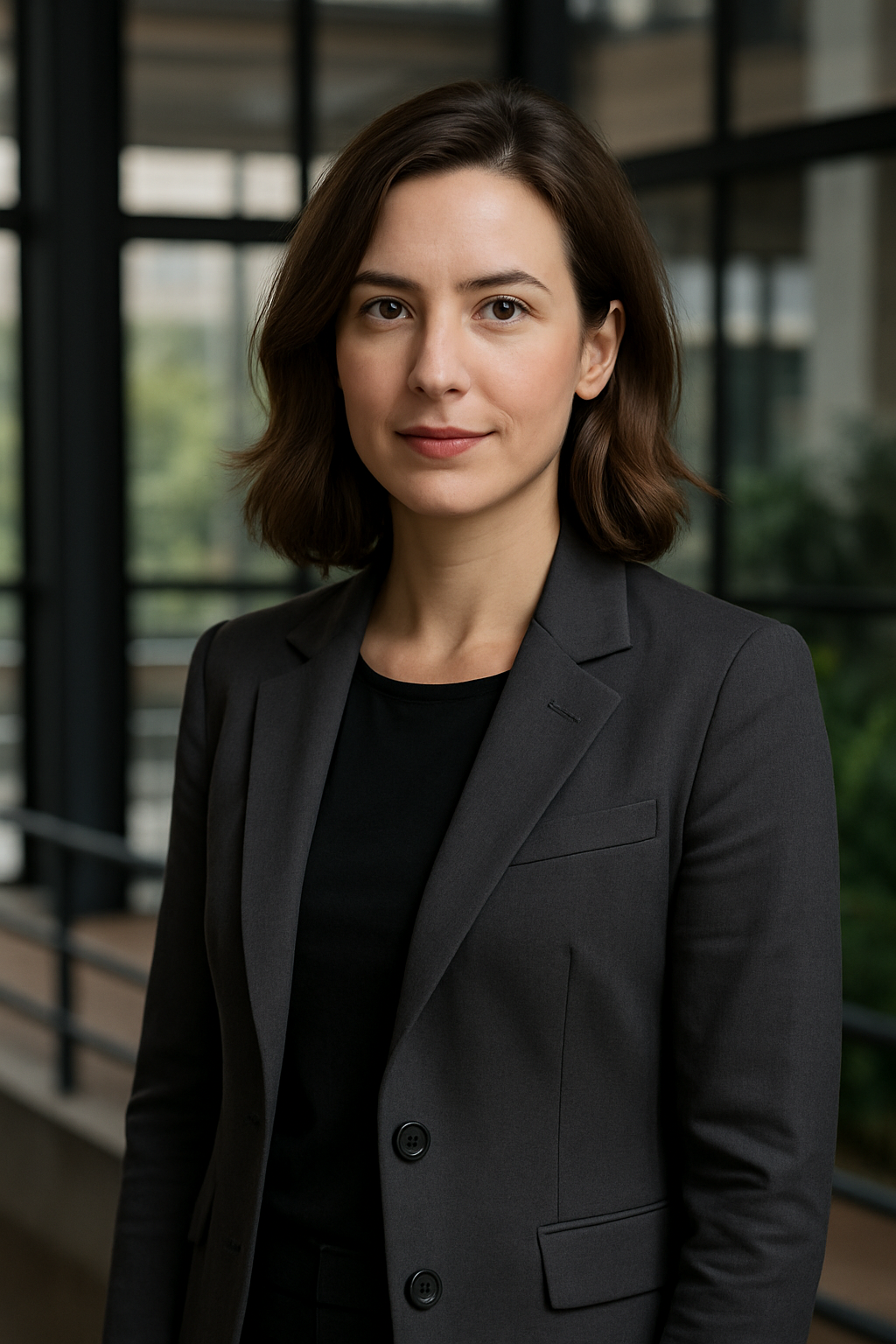 Maybe Tess has a smart, contemporary appearance—perhaps in her mid-30s or early 40s, with a polished but approachable demeanor. Think professional attire, but with a bit of a creative edge, maybe in a muted, modern palette. She could have a poised yet dynamic energy, with a focus on appearing both authoritative and empathetic. Her features might reflect a thoughtful and intellectual persona—someone who’s both analytical and visionary.